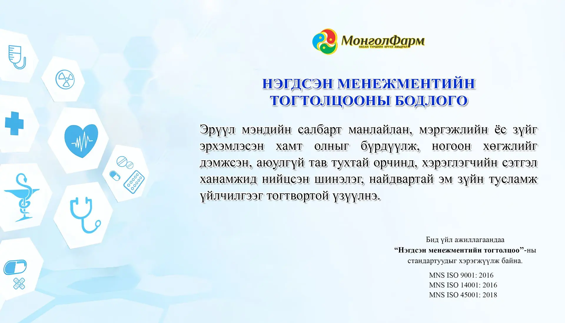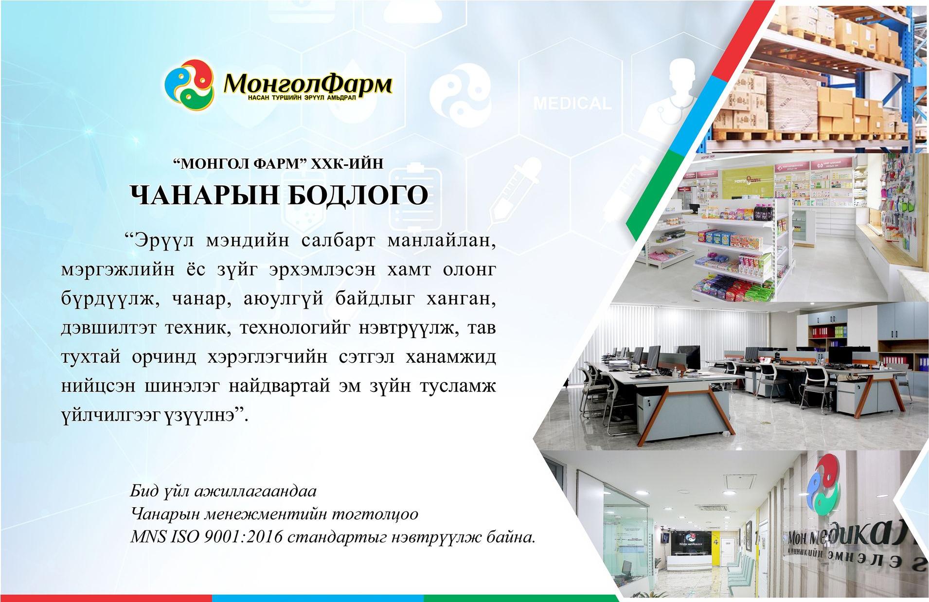 Монгол улсын өнцөг булан бүрт ажиллаж амьдарч байгаа мэргэжил нэгт эмийн мэргэжилтэн, эмзүйн салбарт ажиллаж буй ажилтан, албан хаагч, харилцагч, хэрэглэгч та бүхэндээ "МонголФарм" ХХК хамт олны өмнөөс та бүхэндээ мэндчилж байгаадаа таатай байна.