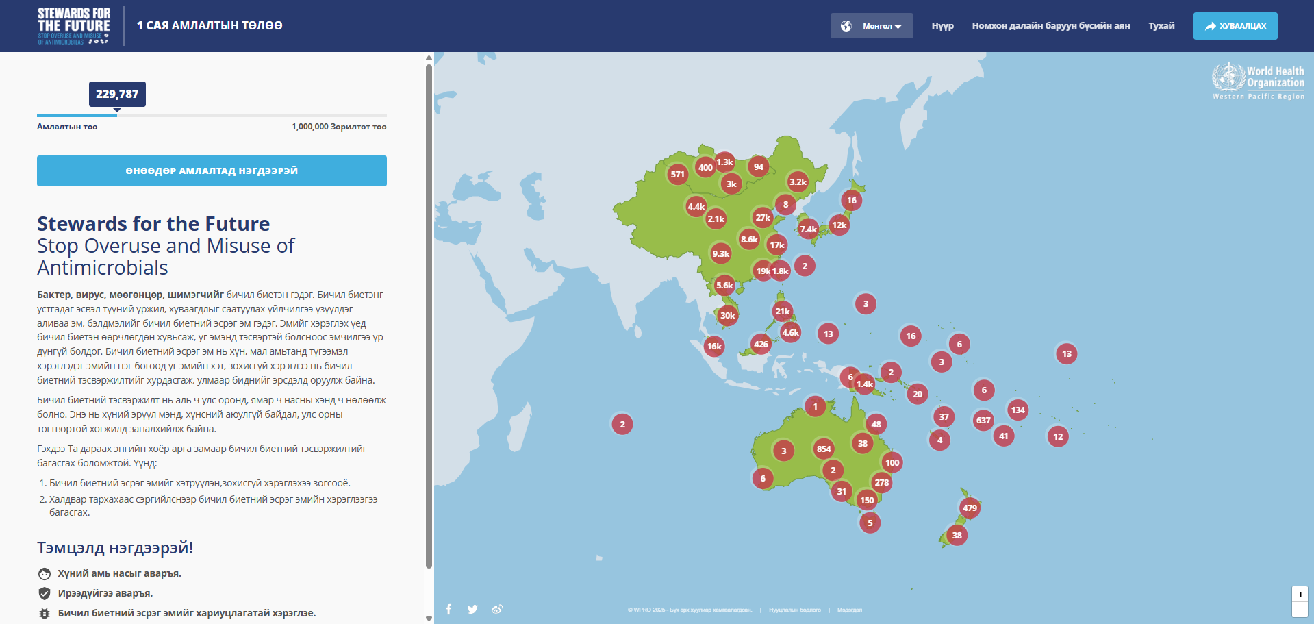 ДЭМБ-иас дэлхий нийтээр 1 САЯ АМЛАЛТ өгөх буюу "бичил биетний эсрэг эмийг зохистой хэрэглэх" амлалтад нэгдэхийг улс орнуудад уриалж байна.